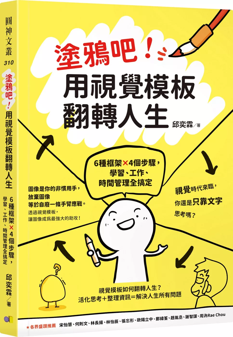 《塗鴉吧!用視覺模板翻轉人生》一書由視覺化教練邱翊歆撰寫,他在書中詳細介紹了視覺筆記的六種常見框架和DRAW四步驟視覺筆記流程。